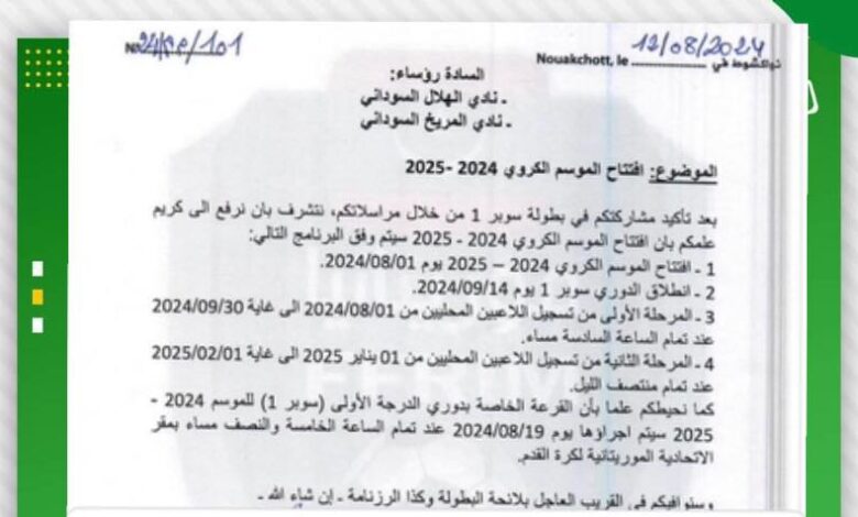 وجه الاتحاد الموريتاني لكرة القدم رسالة رسمية لمسؤولي نادي الهلال والمريخ السودانيين يطلعهما علي موعد انطلاق الموسم الجديد بناء علي طلبهما السابق باللعب في الدوري الموريتاني لكن هذا الموضوع فتح حربا قوية بين الاتحاد السوداني لكرة القدم ورؤساء اندية الهلال والمريخ بسبب رفضه لعبهما في الدوري الموريتاني وحرصه علي اقامة دوري في المناطق الآمنة في السودان بينما يريد الفريقان اللعب في الدوري الموريتاني ومن المقرر ان يتم خلال الايام القليلة حسم الموقف النهائي علي ضوء تمكن احد الاطراف السودانية من الانتصار علي الآخر.