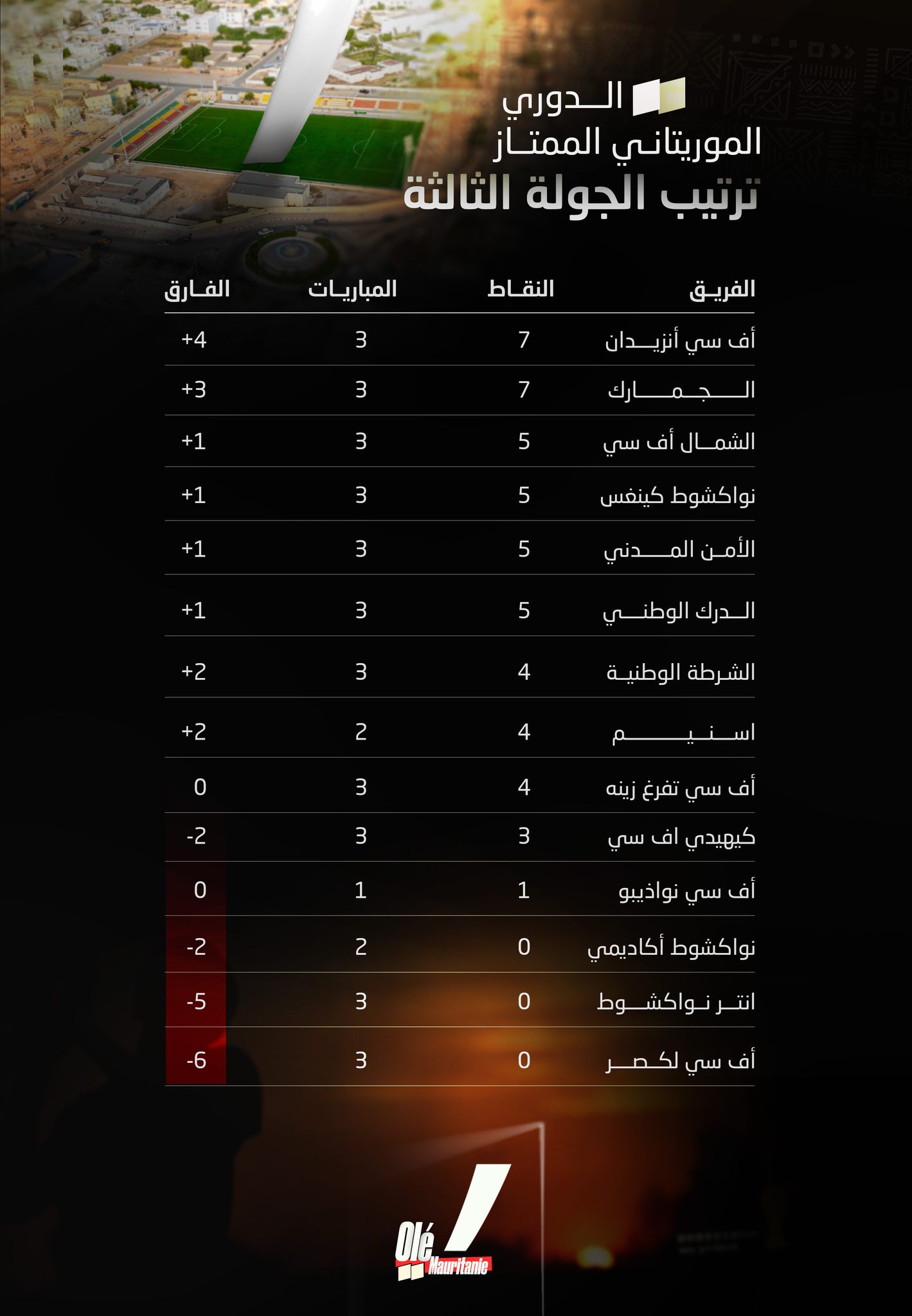 تصدر نادي ازيدان الجولة الثالثة من الدوري الموريتاني صحبة نادي الجمارك بينما تذيل نادي لكصر الترتيب وهذا جدول الفرق بعد الاسبوع الثالث من الدوري الموريتاني نقلا عن اولي موريتانيا