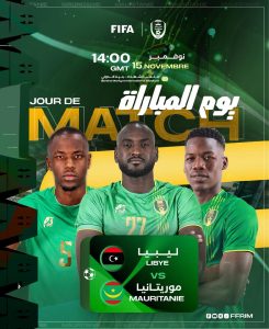 تنطلق المباراة الودية بين منتخبنا الوطني ومنتخب ليبيا في مدينة بنغازي الساعة الثانية بتوقيت غرينتش وسيتم نقلها عبر القناة الرياضية الليبية والقناة الرياضية الموريتانية وستكون اخر مباراة للمنتخب الوطني قبل اللقاء الحاسم مع الكويت في الخامس والعشرين من الشهر الجاري في الدوحة بالدور الحاسم للتاهل لنهاءيات كاس العرب في قط