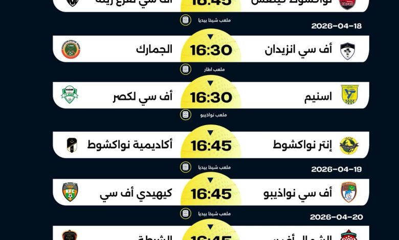 وفي اليوم نفسه، يلتقي إنتر نواكشوط مع أكاديمية نواكشوط في ديربي واعد، قبل أن تتواصل الإثارة يوم 19 أبريل بمواجهة أف سي نواذيبو وكيهيدي أف سي.